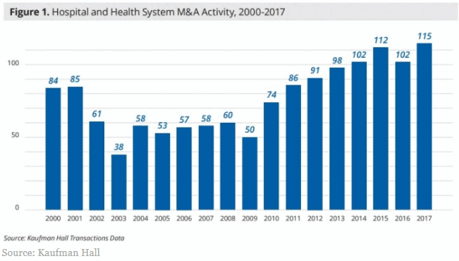 With the cost of healthcare increasing and payment models shifting from volume to value-based reimbursement, provider’s increase in revenue cannot keep up with their costs. Value-based reimbursement puts financial pressure on providers, and accelerates healthcare organization’s desires for efficiency, cost control, and sustainability. An increasingly popular strategy to fulfill these goals is improving the integration of care across the continuum through healthcare mergers and acquisitions. As a result, hospital mergers and acquisitions trends are increasing at a rapid rate. Healthcare organizations announced 115 merger and acquisition transactions in 2017, the highest number in recent history.